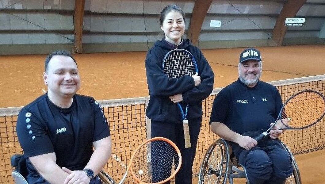 Die beiden Rollstuhlfahrer-Freunde Manuel Wöhrle und Ralf Beisel nehmen seit Oktober 2024 Tennisunterricht bei Ana-Bianca Mihaila in der Tennishalle. Für sie ist das Training auch noch neu und sie freut sich jeden Freitag über ihre motivierten Spieler, denn die beiden Schüler sitzen in einem speziell für die Sportart konstruierten Rollstuhl. Zudem erweist sich der Tennis Force HS II Belag mit dem Hydroslide Tennissand als ideal bezüglich der Härte des Bodens und entsprechend der Beweglichkeit der Rollstühle.