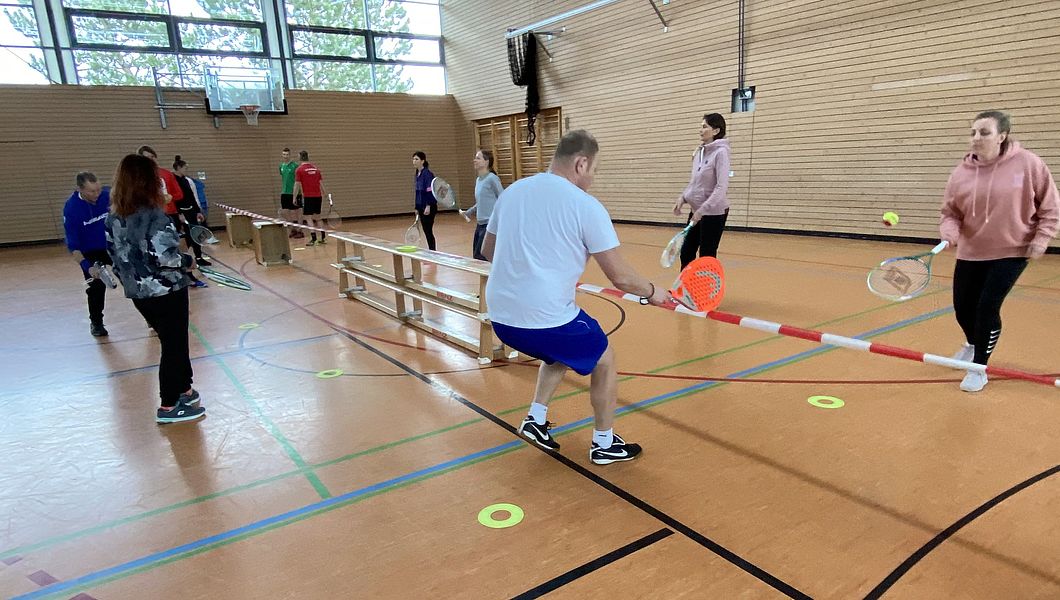Nach dem Mittagessen ging es gestärkt an die Tennisschläger und in die Praxisphase über.Ein vorbreitetes Hallendrittel mit einem normalen Hallenbelag, der allein schon herausfordernd war, mit normalen Tennisbällen Tennis zu spielen.