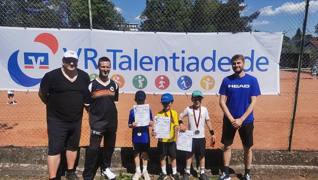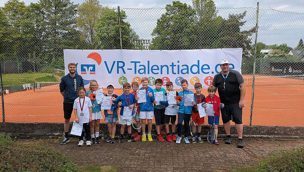 Die Turnierleiter Matthias Schniegel (WTB, links) sowie Antonis Nedeltsos (TC Aalen, rechts) mit den strahlenden Sieger:innen U9m, U10w und U10m