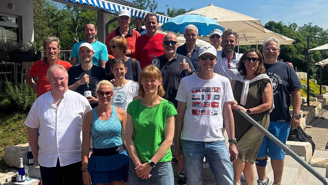 Gruppenbild Siegehrung Bezirksmeisterschaften Seniorenaltersklassen beim TC BW Zuffenhausen, v.l. Bezirkssportwart Manfred Kiefer und eingereiht auch Mitglieder des neuen TC BW-Vorstandes.