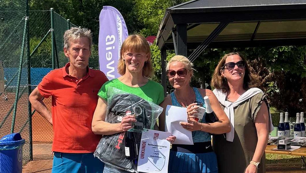 Siegerehrung Damen 40 mit Jessica Breitinger (TC BW Zuffenhausen) und Lucinde Recknagel (TEC Waldau), eingerahmt von den neuen TCBW-Vorstandsmitgliedern Eric Lüdtke und Tina Bässler.