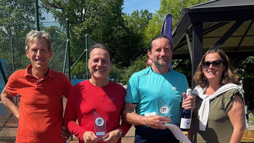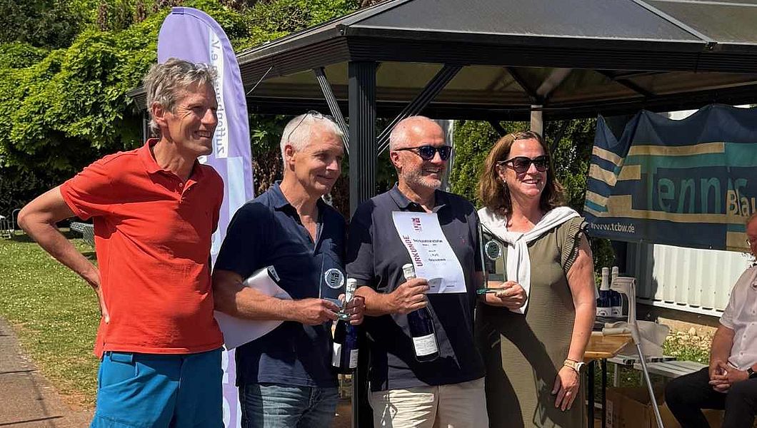 Siegerehrung Herren 55 mit Arpad Horvath (TC BW Zuffenhausen) und Siegfried Reimann (TA VfL Sindelfingen), eingerahmt von den neuen TCBW-Vorstandsmitgliedern Eric Lüdtke und Tina Bässler.