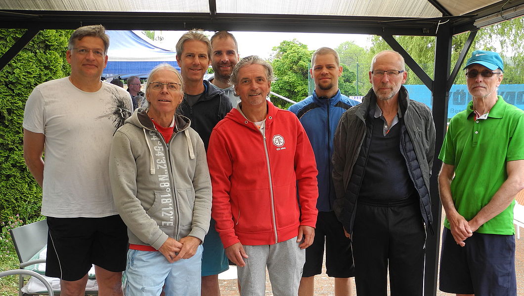 Finalpaarungen bei den Seniorenmeisterschaften in Zuffenhausen (v.l.) mit Jan Schmidt-Daenicke (TC Bad Wildbad), Thomas Volkmann (TC Herrenberg), Franz-Peter Stümper (TA TSV Waldenbuch), Mark Leipersberger (TC BW Zuffenhausen), Helmut Bayer (Cannstatter TC), Lars Schwickert (TC BW Zuffenhausen), Stefan Weigelt (TC Ehningen) und Rolf Gäckle (TA TSV Neuhengstett).