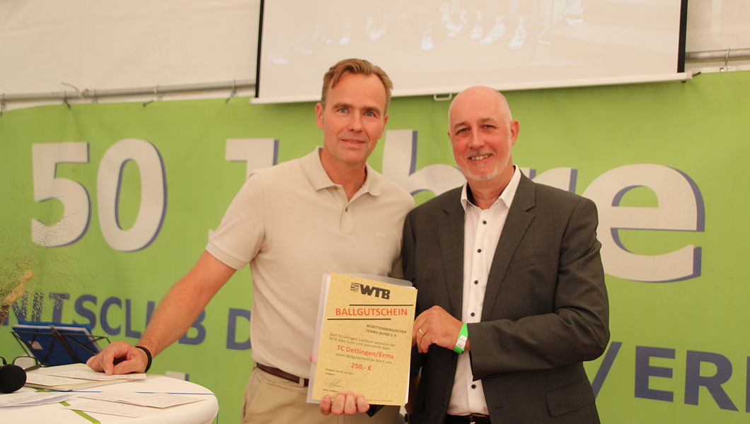50 Frauen und Männer hatten am 19. November 1971 bei der Gründungsversammlung spontan ihren Beitritt zum Tennisclub erklärt, zwischenzeitlich hat der Verein 375 Mitglieder. Rudolf Röhrer, Helmut Bückle und Helmut Coconcelli sowie Heinrich Reiber hatten die Vereinsgründung initiiert und vorbereitet, letzterer wurde zum ersten Vorsitzenden des jungen Vereins gewählt. Mit dem jetzigen Amtsinhaber Axel Schotte plauderte er vor rund 130 Gästen über die Anfänge und die Suche nach am Tennis interessierten Dettingern: „Wir haben uns das Telefonbuch vorgenommen und geschaut, wer passen könnte.“ Die Zeiten seien für den damals als elitär angesehenen Sport nicht einfach gewesen: Habe man samstags Tennis gespielt, seien Landwirte auf ihren Traktoren an der Anlage vorbeigefahren und hätten gerufen, man solle lieber etwas schaffen. Fünf Jahrzehnte später habe sich der Verein laut Heinrich Reiber Dank engagierter Mitglieder sehr gut entwickelt: „Wir haben lediglich den Grundstein dafür gelegt.“
