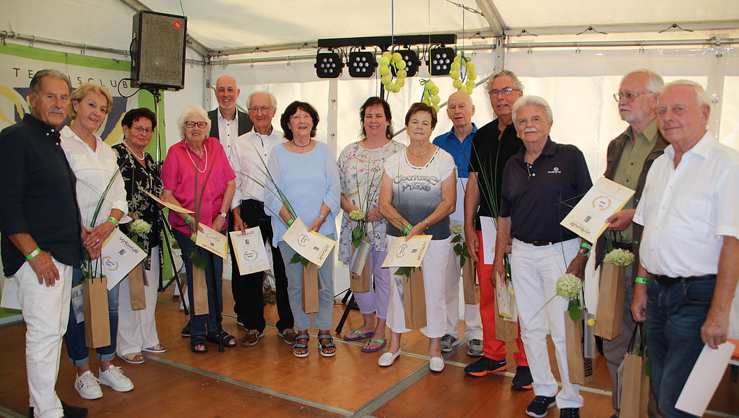 Der TC Dettingen präsentiert sich im Jubiläumsjahr „plus eins“ als moderner Verein, der sich seiner Wurzeln bewusst ist: Im Focus des offiziellen Teils des wegen der Coronapandemie um ein Jahr verspäteten Festes zum 50-Jährigen Bestehen stand die Ehrung der Gründungsmitglieder Paolo und Ingrid Righi, Gisela Röhrer, Margrethe Röhrer, Helmut Coconcelli, Hedwig Boneberg, Heinrich Reiber, Gerta und Carmen Coconcelli, Helmut Bückle, Wolfgang Gutbrot, Willi Kleih und Werner Notz.