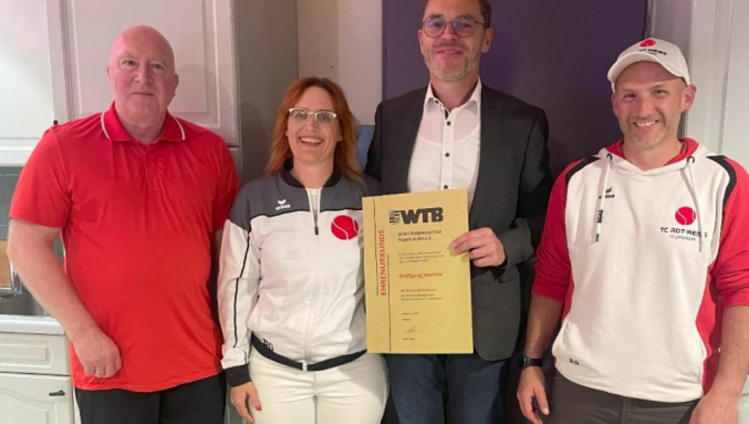 Eher zufällig wurde entdeckt, dass es im Vorstand des TC Villingendorf ein langjähriges treues Mitglied gibt. So wurde Bezirksvorsitzender Stefan Linke am 25. April 202 zur Generalversammlung des TC Rot-Weiß Villingendorf eingeladen, um diese Ehrung vorzunehmen. Wolfgang Hermle ahnte nichts von dieser Ehrung und war sichtlich gerührt.