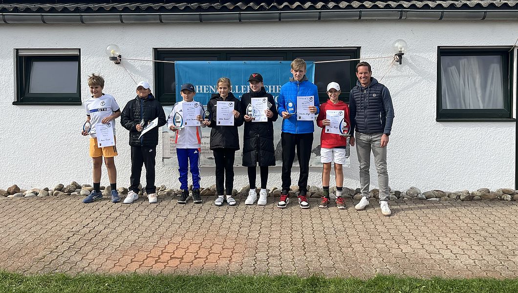Junioren U12: Überraschungen waren hier an der Tagesordnung. So erwischte es die beiden topgesetzten Leon Hunt (TA SV Böblingen) und Simon Batt (TC Eggingen/Baden) bereits in der zweiten Runde mit deutlichen Zweisatzniederlagen. Groß auf spielte in der oberen Hälfte auf fünf gesetzte Mikko Deuschle (TA TSV Denkendorf). Er gab auf dem Weg ins Finale keinen einzigen Satz ab, auch wenn sich Lokalmatador Henri Bauer im Halbfinale, vor allem im ersten Satz, noch kräftig wehrte. In der unteren Hälfte, in der über 2-stündige Matches an der Tagesordnung waren, trafen im Halbfinale der auf sieben gesetzte Felipe Jessel (TC Mössingen) und der auf acht gesetzte Nick Hausch (TC RW Spaichingen) aufeinander. Nach über 130 Minuten setzte sich Jessel letztendlich verdient mit 7:6 und 6:4 durch. Im Finale zeigte sich dann der vorherige Kräfteverschleiss, demzufolge sich Mikko Deuschle mit 6:1 und 6:2 souverän den Titel sicherte.