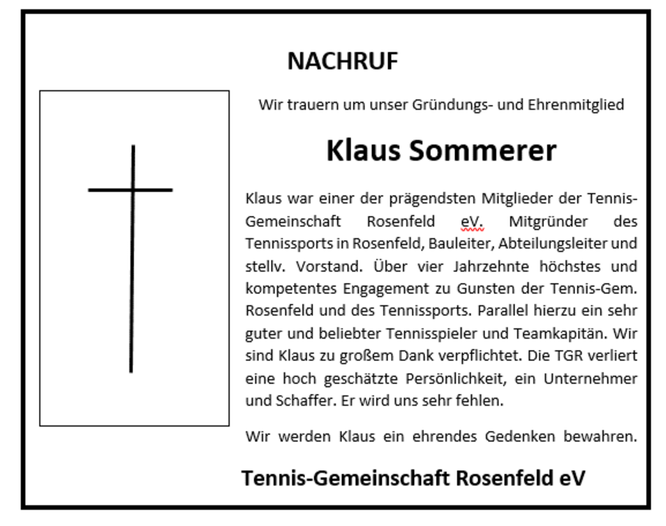 Die prägendste Persönlichkeit der Tennis-Gemeinschaft Rosenfeld ist von uns gegangen, so Vorstand Martin Sülzle nach Erhalt der Hiobsbotschaft, dass Klaus Sommerer verstorben ist. Klaus Sommerer war Gründungsmitglied der 1976 geründeten Tennisabteilung. Sommerer hat in den ersten Jahren als Bauleiter beim Bau der ersten zwei Plätze die Verantwortung übernommen. Von Genehmigung bis zur Fertigstellung war Klaus an erster Stelle. Unendlich viele Arbeitseinsätze organisierte Sommerer, er war der wo die meistern Arbeitsstunden für die TG leistete, so Sülzle.
