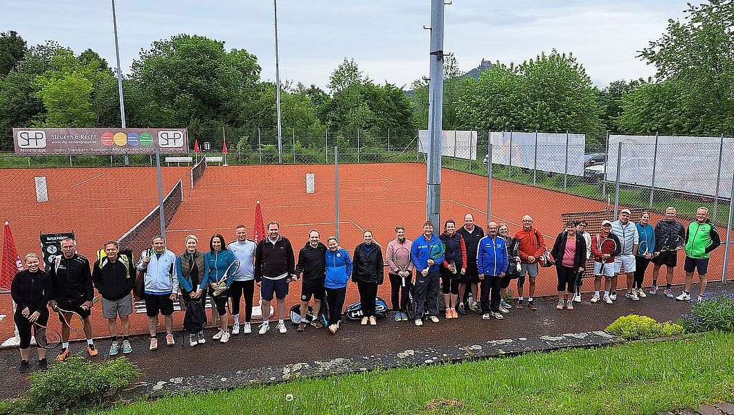 Am letzten Maiwochenende begrüßte die TG Bisingen 12 Damen und 14 Herren zum HTOT auf ihrer Anlage. Leider hat der von vielen gewünschte und für die Natur dringend benötigte Regen ausgerechnet eine halbe vor dem geplanten Spielbeginn ergiebig eingesetzt. Bei Kaffee, Kuchen und Brezeln warteten die Sportlerinnen und Sportler geduldig auf das Regenende und starteten schließlich mit etwas Verspätung ins Turnier. Ab und zu hat sich dann aber sogar die Sonne blicken lassen.