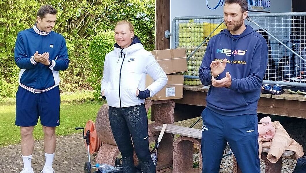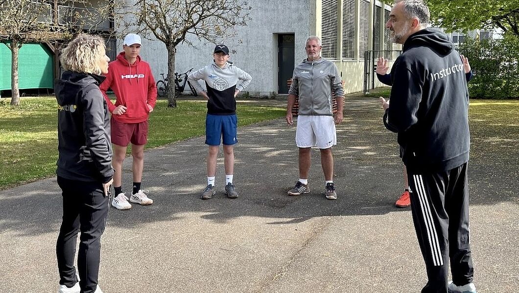 Die richtige Aufstellung im Doppel, verschiedene Spieltaktiken, eine aktive Spielgestaltung oder die Vorbereitung und Platzierung eines Winners: In den einzelnen Stunden hatten die Teilnehmerinnen und Teilnehmer die Möglichkeit, direkt von den Profis zu lernen und Spielsituationen zu üben. Dabei bleib immer auch Zeit, Fragen zu stellen oder sich zum Abschluss der Trainingseinheit mit ihnen zu messen – was mit viel Freude angenommen wurde und zu sehenswerten Duellen führte. Die sechs Gruppen wechselten nach der Einheit mit dem jeweiligen Trainer – oder der Trainerin – auf den nächsten Platz und waren so den ganzen Vormittag gefordert. Etwas ruhiger ging es hingegen bei Kerstin Doll und Markus Bertele zu. Gemeinsam stellten sie die Trainingsmethode Kinsporth vor, die das körperliche Training mit der Kinesiologie und den Meridianenergien aus der Traditionellen Chinesischen Medizin (TCM) kombiniert. Die einzelnen Übungen erforderten zwar wenig körperlichen Einsatz, waren jedoch dennoch herausfordernd, da sie dazu dienen, beide Gehirnhälften zu verknüpfen. Auf diese Weise werden nicht nur Konzentrationsfähigkeit und Fokussierung gesteigert. Kinsporth hilft zudem dabei, Stresssituationen besser zu meistern – und die können in einem Match durchaus vorkommen. „Die Verbandsrunde kann starten“, freut sich Organisator und Vorstandsvorsitzende der Tennisfreunde Birkenhard. „Alle, die das Programm heute absolviert haben, sind definitiv bestens gerüstet.“