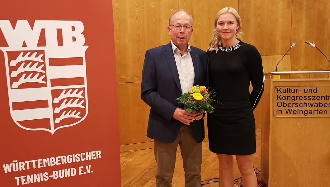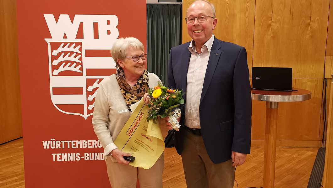 Nach annähernd 20 Jahren gab Edith Pichler aus Altersgründen ihren Rückzug als Referentin für Medien- und Öffentlichkeitsarbeit bekannt. Gernot Maier dankte ihr für die geleistete Arbeit und übergab ihr die „Silberne Ehrennadel vergoldet“ des Württembergischen Tennis-Bundes.