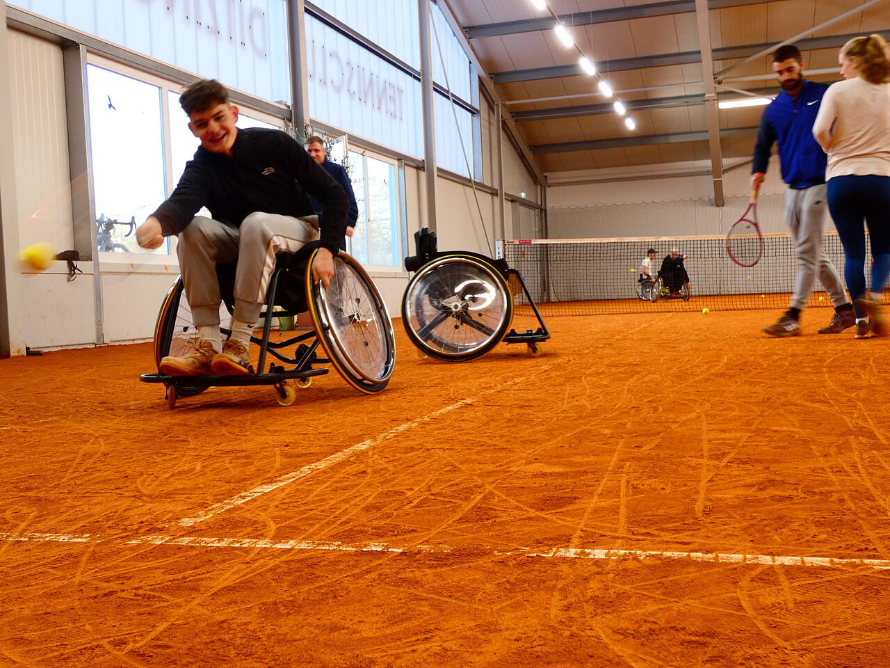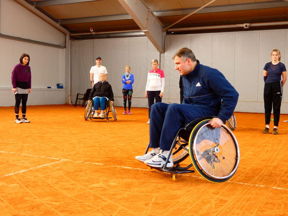 Dazu trafen sich 15 Teilnehmer:innen in der neuen TCD-Tennishalle unter der fachlichen Leitung der Tennisschule Darko Bauer. Das Basismaterial (Schläger, Blinden-Masken, Rasselbälle, Linien, etc.) wurde vom WTB zur Verfügung gestellt, vier Sportrollstühle kamen von TCD-Partner, der Pädagogischen Hochschule Ludwigsburg (PH LB).