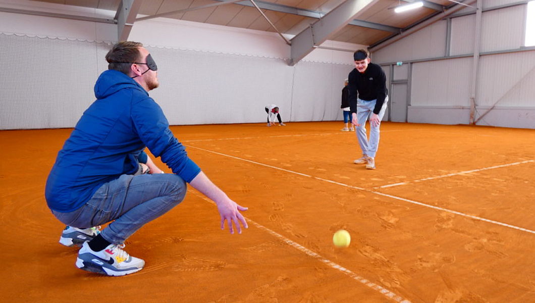 Nach einer kurzen Begrüßung und Einführung mit einem Inklusions-Video des Deutschen Tennisbundes (DTB) ging es auch gleich los mit dem ersten Teil des Workshops: Blindentennis. Hier wurden die Basis-Techniken und Konzepte erklärt und anschließend paarweise geübt: geführter Maskenlauf durch die Halle, Ortung und Verfolgung des Rasselballs, Aufschlagtechnik, etc.