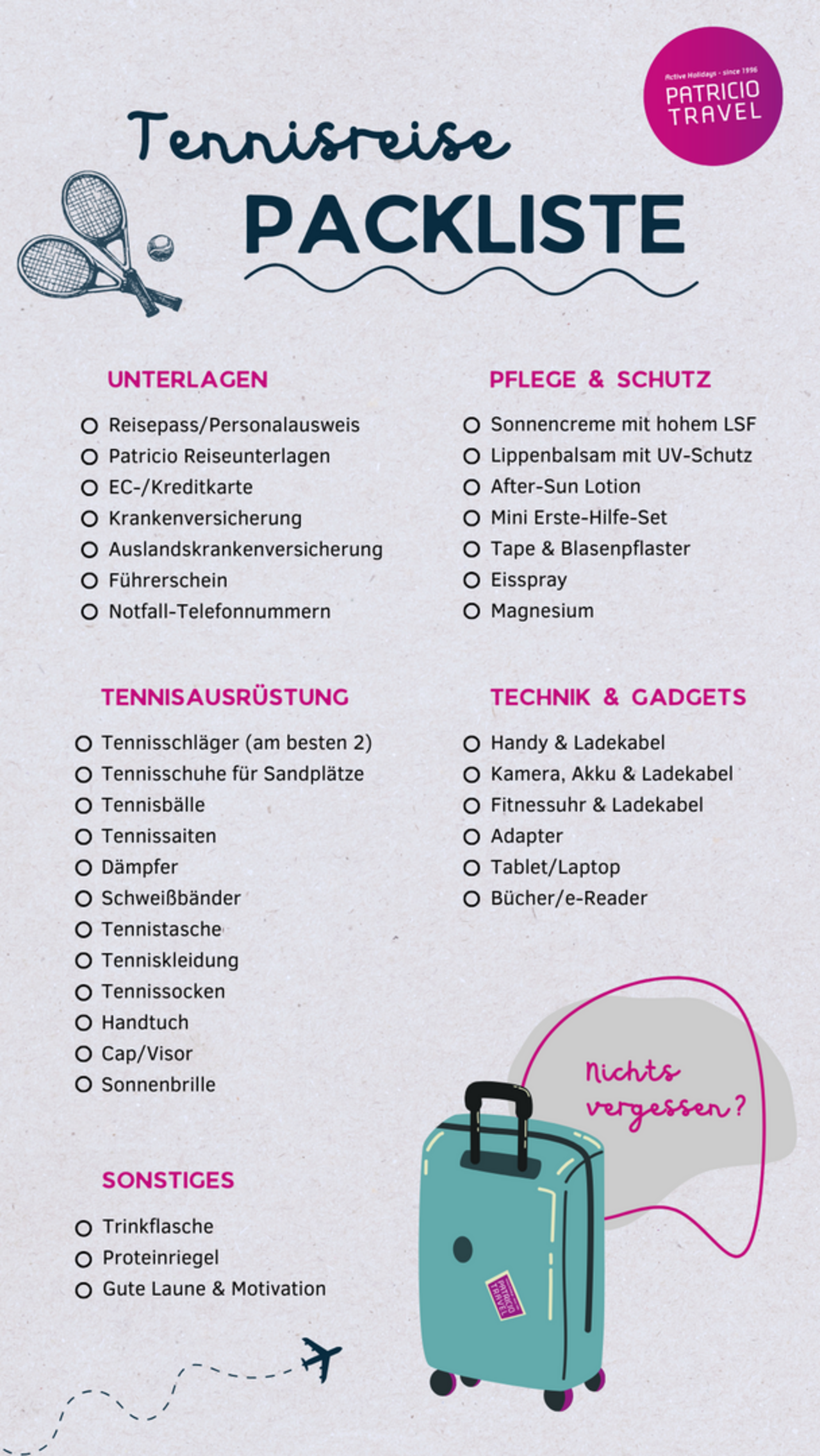 Tennisplätze in traumhafter Umgebung, professionelles Training und eine perfekte Organisation – genau das erwartet dich bei einer Reise mit Patricio Travel! Damit du optimal vorbereitet bist, haben wir die ultimative Packliste zusammengestellt. Von den wichtigsten Reiseunterlagen über die passende Tennisausrüstung bis hin zu Pflege, Schutz und Technik – hier findest du alles, was du für deine Reise benötigst.