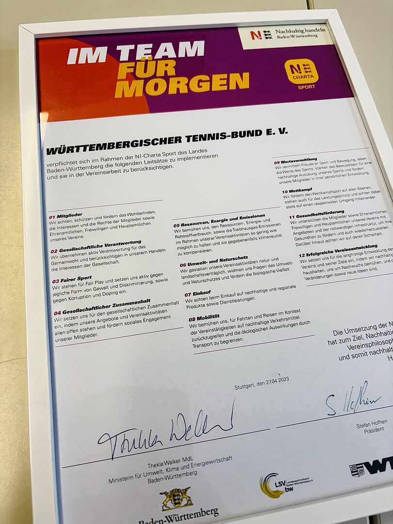 Der WTB hat im Jahr 2024 den 2. Konvoi des Nachhaltigkeitsprogramms des baden-württembergischen Umweltministeriums und des Landessportverbandes N!-Charta abgeschlossen und führt seit dem 14.01.2025 den dritten Tennis-Konvoi durch. Die Urkundenübergabe erfolgte am 11.06.2025 im Rahmen des “Sustainability Day” bei den BOSS OPEN. Der 4. Konvoi ist ab Herbst 2025 geplant.