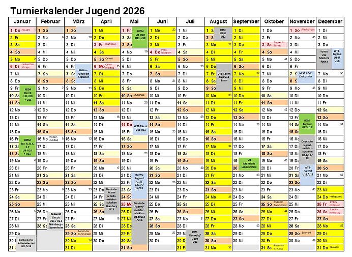 Der Jugendkalender umfasst Turniere wie die Meisterschaften in Württemberg, überregionale Meisterschaften und Einladungsturniere sowie die Endrunden der VR-Talentiade und Verbandsrunde.