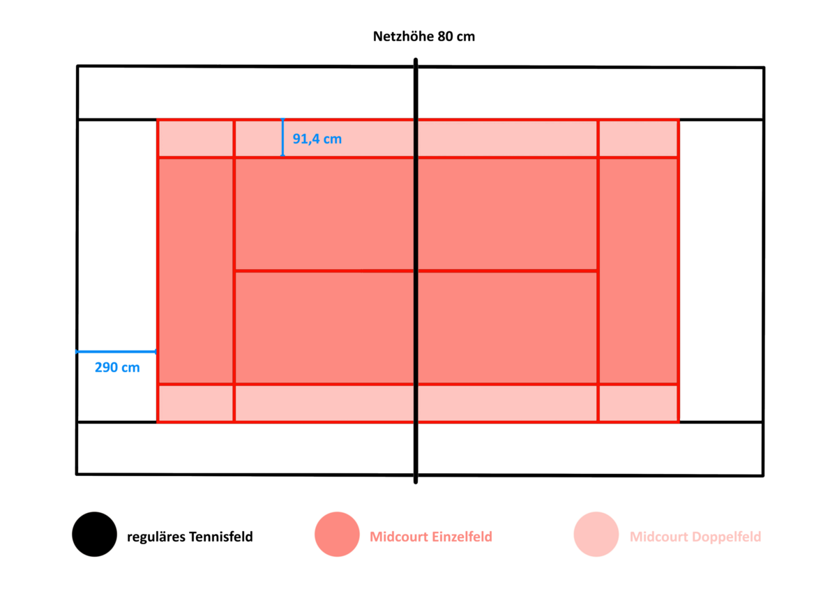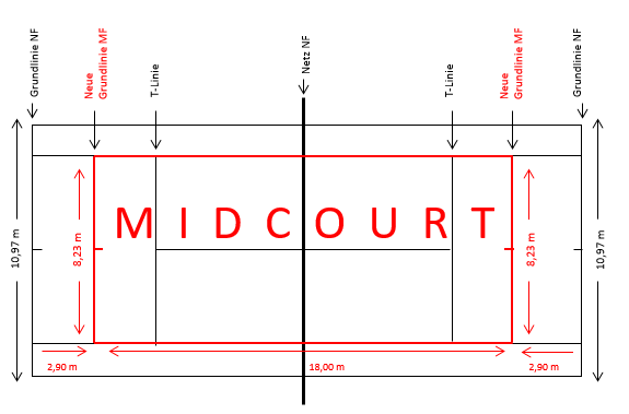 NEU: Die Feldgröße im Midcourt wird auf die schmale Variante angepasst (Einzelfeld Maß 18m x 6,40m; Doppelfeld Maß 18m x 8,23m).