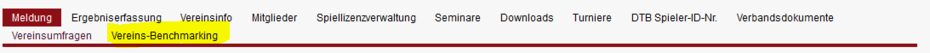 Das DTB Vereins-Benchmarking ist als ein neuer Bereich im Bereich der Spielbetriebs- und Vereinsadministration (Vereinsaccount) angelegt. Als Verein sind Sie bereits registriert und haben einen individuellen Zugang. Jeder Verein hat maximal fünf Vereinsadministratoren, die auf den neuen Bereich zugreifen können. Sie können aber auch individuelle Zugänge nur für den neuen Bereich Benchmarking vergeben.