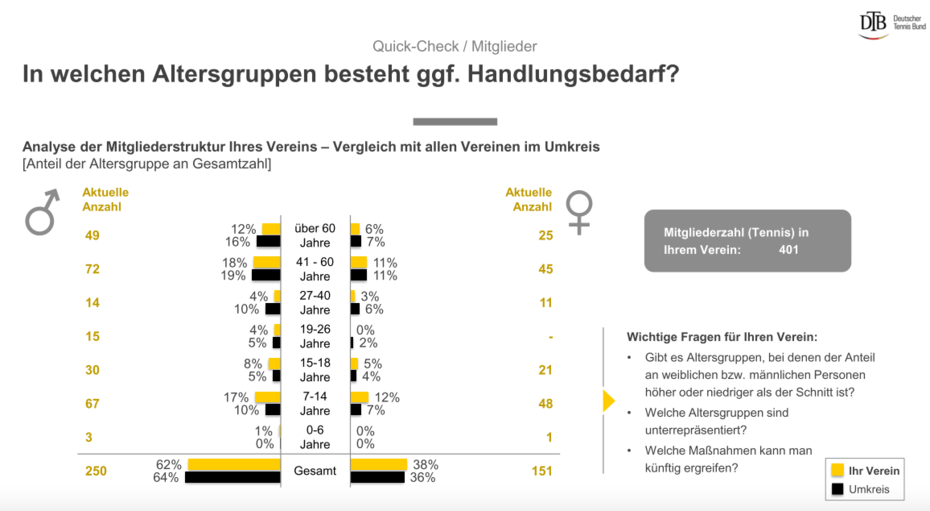 Die individuelle Kurz-Analyse der Situation Ihres Vereins, der sogenannte Quick Check, bietet Ihnen erstmalig die Chance, Ihren Verein anhand individuell für Ihren Verein berechneter Kennzahlen mit anderen Vereinen zu vergleichen. Hierzu zählen beispielsweise die Mitgliederentwicklung, die Altersverteilung der Mitglieder oder auch die Zahl an Übungsleiter*innen und Trainer*innen.