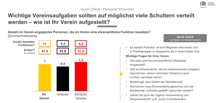 Der Quick-Check ist eine Kurz-Analyse der Vereinsdaten im Vergleich mit ähnlichen und umliegenden Vereinen. Er resultiert aus einer automatisierten Analyse der an den Landesverband gemeldeten Vereinsdaten, wie Mitgliederzahlen und deren Altersstruktur oder Anzahl der Mannschaften. Diese werden übersichtlich aufbereitet und mit den Daten von Vereinen in der Umgebung und ähnlich strukturierten Vereinen verglichen.
