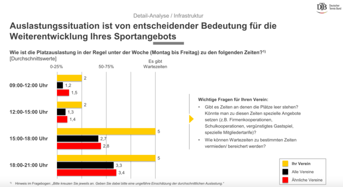 Das DTB Vereins-Benchmarking bietet den Tennisvereinen die Möglichkeit zur individuellen Selbstanalyse. So können Stärken und Schwächen des Vereins sichtbar gemacht werden, indem dieser mit umliegenden und ähnlichen Vereinen im Detail verglichen wird.