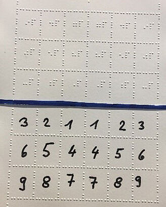 Das Blatt zeigt eine Raumaufteilung der beiden T-Felder auf beiden Spielfeldseiten. Ein T-Feld ist in 3x3 = 9 gleichgroße Felder aufgeteilt. Die Felder sind vom Netz aus gesehen von der Innen- zur Außenlinie aufsteigend von 1 bis 9 (1-2-3,4-5-6,7-8-9) nummeriert. Für eine Ansage der Trainer:innen, in welches Feld der Ball zugespielt wird und als Feedback, wo der selbst geschlagene Ball der Spieler:innen landet, hilft bei der Orientierung und Imagination des Feldes.