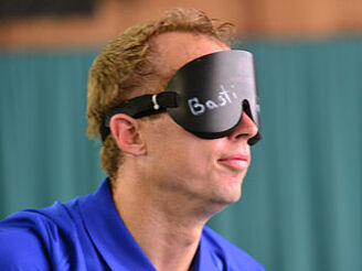 Die Blinden-Sport-Maske oder Dunkelmaske (keine Stoff- oder Schlafmaske) besteht aus einem weichen, atmungsaktiven Material. Sie hat eine perfekte Passform, sitzt sicher und gewährleistet 100% Sichtschutz. Die Maske bietet einen gewissen Schutz ggf. empfindlicher Augen bei Zusammenstößen oder Balltreffern und ermöglicht eine faire Spielbedingung. Eingesetzt wird sie bei Workshops zum Transfer und ist für B1 bei Turnierspielen Pflicht.