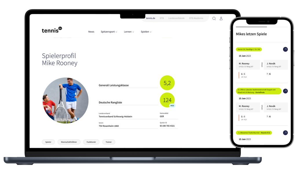 Ab sofort sind die Spieler-, Ligen-, Mannschafts-, Turnier-, und Veranstaltungssuche über tennis.de erreichbar. Darüber hinaus enthält die Plattform Tabellen, Spielpläne, Meldelisten und Ergebnisse zu allen Mannschaften und Turnieren. Aber das Beste: tennis.de präsentiert über 1 Million Spielerprofile, mit allen Ergebnissen, Statistiken und Rankings jetzt noch übersichtlicher. Und das sowohl auf deinem Handy als auch am Desktop.