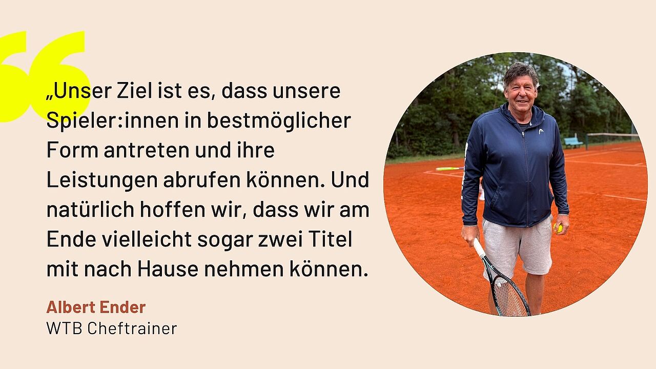 Betreut werden die Athletinnen und Athleten vor Ort vom Trainerteam Jonas Hartmann, Michael Wennagel, Hans-Dieter Beutel, Yannick Maden und Albert Ender. Da beim Turnier Off-Court-Coaching erlaubt ist, möchte der WTB möglichst viele Matches aktiv begleiten, um die Spieler:innen optimal zu unterstützen.