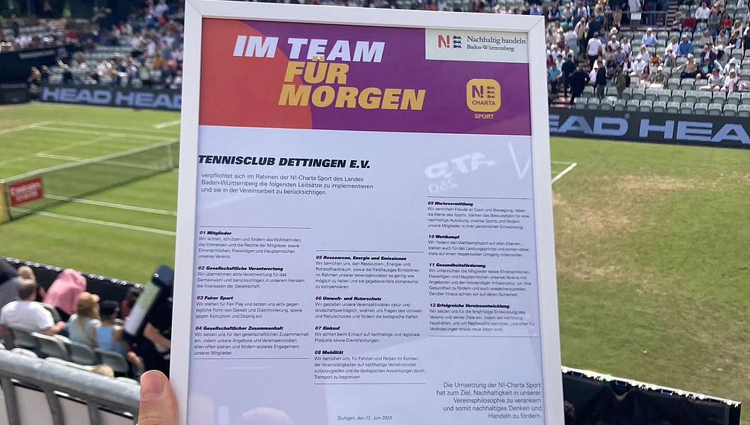 Ob bei Vereinsfahrten, bei der Beschaffung neuer Sportgeräte, bei Vereinsfeiern oder beim Wettkampf – es gibt viele Möglichkeiten für Sportvereine und Sportverbände, nachhaltiger zu handeln. Um dabei klare Schwerpunkte zu setzen und Erfolge sichtbar zu machen, hat der TC Dettingen die N!-Charta Sport unterzeichnet. Diese freiwillige Selbstverpflichtung wurde 2019 von der Nachhaltigkeitsstrategie Baden-Württemberg gemeinsam mit Sportvereinen und Sportfachverbänden entwickelt.