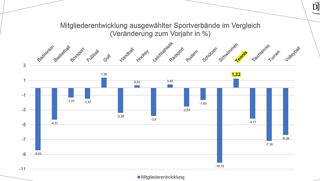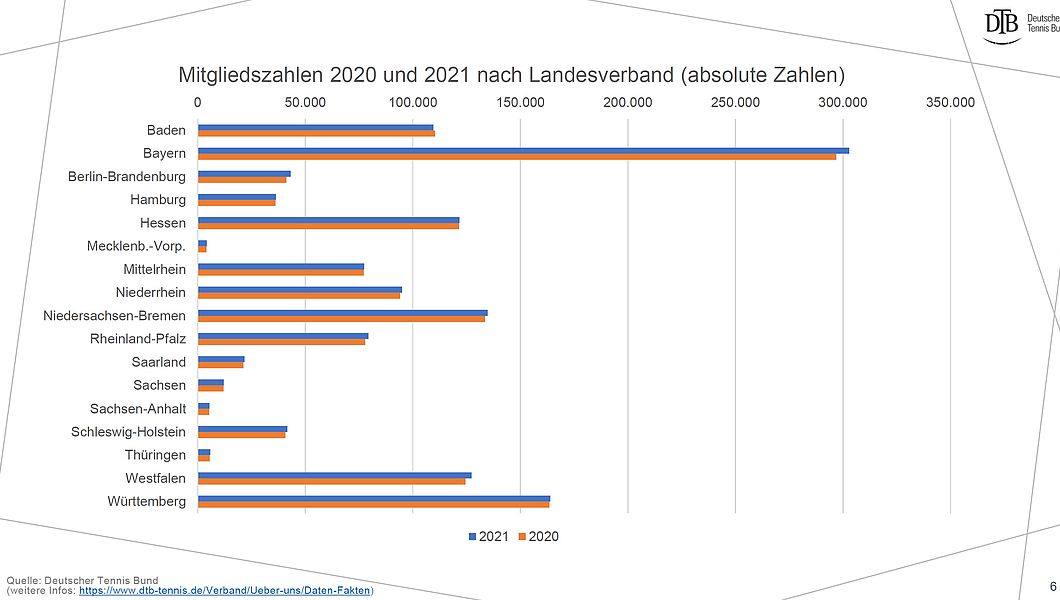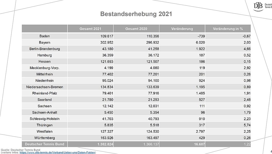 Der Deutsche Tennis Bund (DTB) verzeichnet zum ersten Mal seit 1995 wieder steigende Mitgliederzahlen. Während 2020 noch 1.366.137 Menschen einem Tennisverein angehörten, ist die Zahl der tennisspielenden Vereinsmitglieder – trotz Corona-Pandemie und sinkender Mitgliederzahlen im DOSB – um rund 17.000 gestiegen.