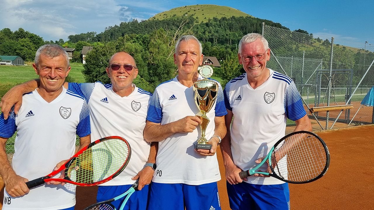So erwartete die D40-Mannschaft am Samstag, 20.07.2024 bei heißen 33°C die D40 der TG Bisingen. Es sollte nochmals spannend werden! In den Einzeln konnten bei einer Hitzeschlacht Christine Zurek-Frank (6:4, 6:2) und Claudia Zimmermann (6:1, 6:0) ihre Gegnerinnen deutlich in die Schranken weisen, Jutta Schiefer (3:6, 3:6) und Petra Tichaczek-Dischinger (5:7, 3:6) hatten nach langen und spannenden Ballwechseln allerdings das Nachsehen. Nach den Einzeln lautete der Zwischenstand daher 2:2. Die Doppel also mussten die Entscheidung über den Titel bringen! C. Zimmermann und Silke Fürste ließen im zweiten Doppel nichts anbrennen: souverän erspielten sie den dritten Siegpunkt für die SPG (6:0, 6:2). J. Schiefer/C. Zurek-Frank kämpften bis zum Matchtiebreak, mussten sich den Gegnerinnen letztlich aber doch geschlagen geben (4:6, 6:2, 2:10). Dennoch knallten nach dem letzten Ballwechsel die Sektkorken: Aufgrund der besseren Satzbilanz konnte die SPG Beutelsbach/Schnait trotz des 3:3-Endergebnisses den Sieg feiern - und sich mit einer tollen Leistung aller Spielerinnen, die teils auch an den vergangenen Spieltagen zum Einsatz gekommen waren, völlig verdient über ihren ersten Titel als Württembergischer Meister 2024 freuen! (Es spielten außerdem an den anderen Spieltagen: Marion Hahr, Simone Schmittner).