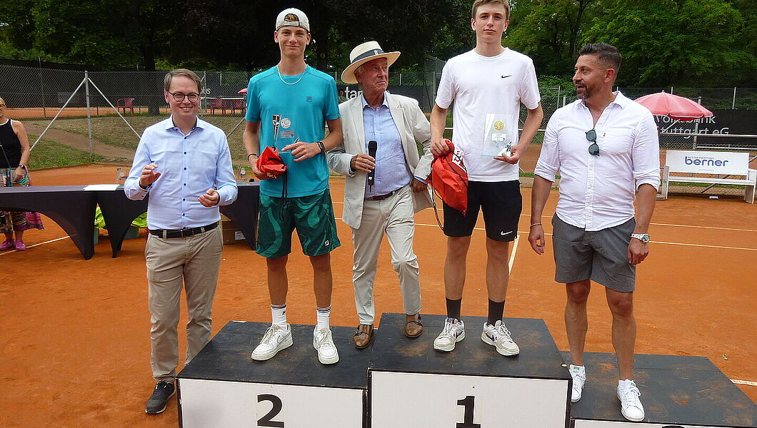 WTB-Kaderspieler Lasse Bohr holt sich den Titel in der U16-Konkurrenz. Das kanadische Team dominiert bei der Jungs U14 beim internationalen TE-Turnier des Tennis-Clubs Waiblingen. Turnierdirektor Peter Hagedorn erhielt die Ehrenmünze der Stadt Waiblingen.