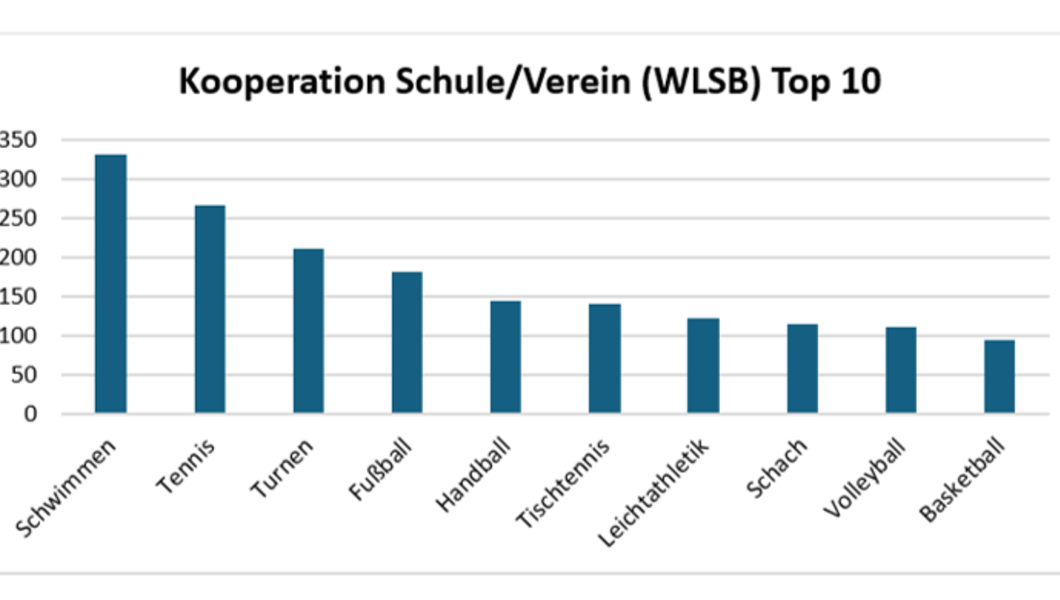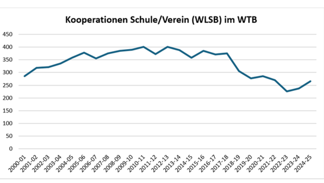 Im Ranking der Top 10-Sportarten steht der Tennissport seit Jahrzehnten immer auf „dem Treppchen“. Im Einzelnen betrachtet, finden sich die Tennisvereine im aktuellen Schuljahr hinter den Schwimmern auf dem zweiten Platz (siehe Grafik 1). Nach Jahren des Rückgangs in den Kooperationszahlen, die sich auch die anderen Sportarten nicht anders gezeigt haben, sind rein statistisch betrachtet die Antragszahlen seit zwei Jahren wieder im Positivtrend: Steigerung im Schuljahr 2024/2025 gegenüber dem letzten Schuljahr um satte 11.3 % (siehe Grafik 2).