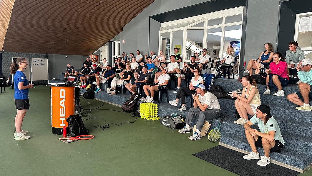 WTB-Mitarbeiterin Rebecca Bäuerle (Ressort V, Sportentwicklung), Markus Knödel (Cheftrainer Ausbildung & Training) und Michael Wennagel (Cheftrainer Sportentwicklung) begrüßten insgesamt 37 engagierte Trainer:innen, die sich intensiv mit der Frage auseinandersetzten, wie Tennis für alle zugänglich gestaltet werden kann.