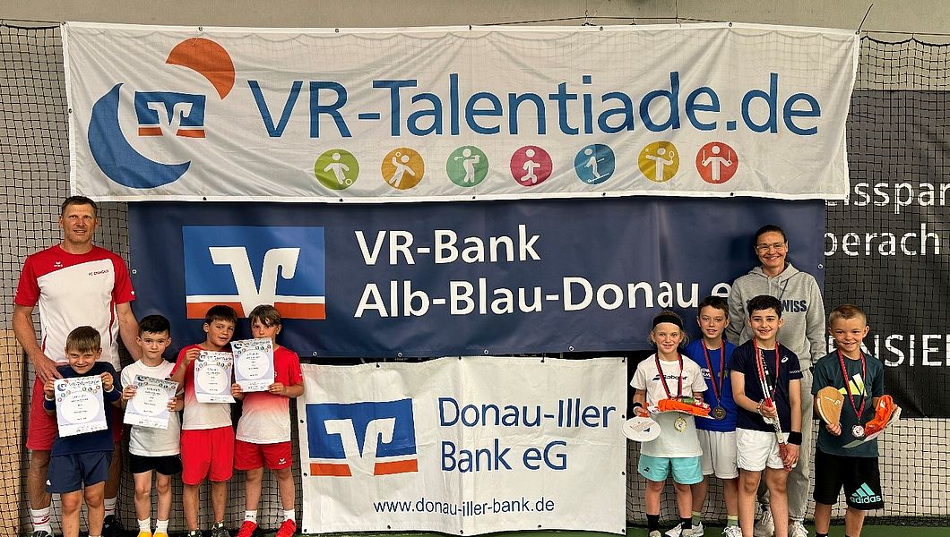 Der TCE wurde hier von der Donau Iller Bank und der VR-Bank ALB-Blau-Donau unterstützt und der Turnierleiter Jiri Heinisch bedankt sich mit der abschließenden Siegerehrung bei den teilnehmenden Kindern für die tollen Leistungen. Mit der VR-Talentiade leisten die Volksbanken Raiffeisenbanken einen wichtigen Beitrag zur Talentförderung“.