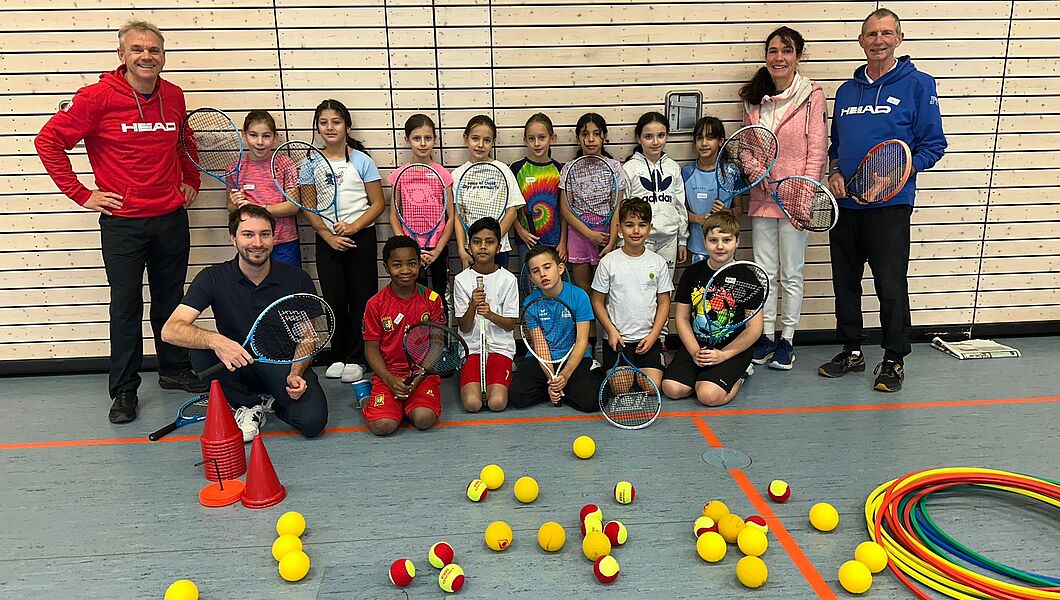 Als die Anfrage vom Württembergischen Tennis-Bund (WTB) an die Schulleitung der Baumbachschule Walheim herangetragen wurde, zögerte diese nicht lange und sagte die Unterstützung für das Videoprojekt „Tennis in der Schule“ zu und so trafen sich 13 Grundschüler der Walheimer Grundschule mit dem WTB-Trainerteam in der Gemeindesporthalle, um Spiel- und Übungsformen für eine Videoproduktion durchzuführen.