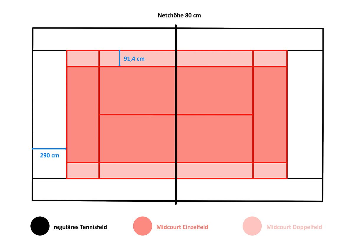 Die Spiele der VR-Talentiade U10 werden im “Midcourt schmal” ausgetragen. Einzelfeld: 18,00 m x 6,40 m (Grafik siehe unten) Doppelfeld: 18,00 m x 8,23 m (Breite des regulären Einzelfelds) Netzhöhe: 80 cm |
