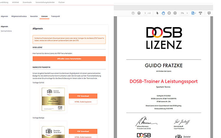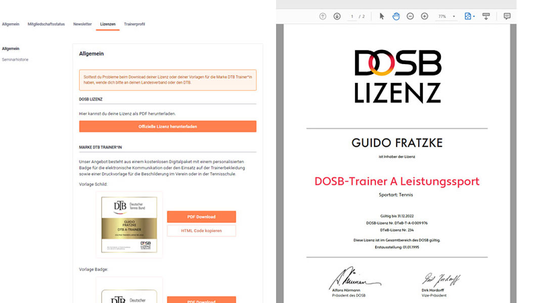 Auch der Servicegedanke wird im neuen Portal großgeschrieben. Im persönlichen Bereich steht die eigene Lizenz als PDF zum Download bereit, genauso wie das digitale Badge der „DTB Marke Trainer“, mit dem sich lizenzierte Trainer*innen nach außen präsentieren können. Auch die Anmeldungen zu Lehrgängen und Fortbildungen mit den dazugehörigen Rechnungen können im persönlichen Bereich verwaltet werden. Im neuen nationalen Veranstaltungskalender werden die Aus- und Fortbildungsveranstaltungen der Landesverbände und des DTB abgebildet.